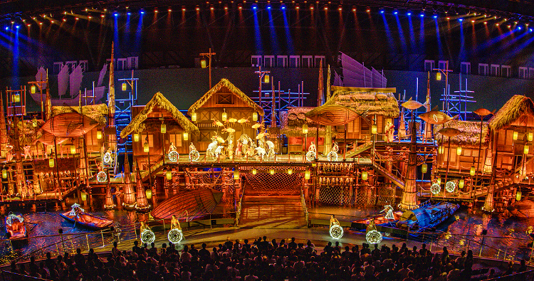 演出打破传统舞台限制,歌舞在岸边起、光影在水面铺,装置艺术和水特效轮番上演,真正实现“人在船中坐,船在画中游”。